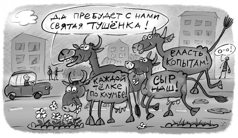 Коровы, которые еще не определились с партийной принадлежностью, на той же неделе отличились тем, что разгуливали прямо в центре Улан-Удэ. Однако, несмотря на отсутствие отличительных знаков, они протестовали против некачественного озеленения города, самоотверженно поедая произрастающее на клумбах безобразие.