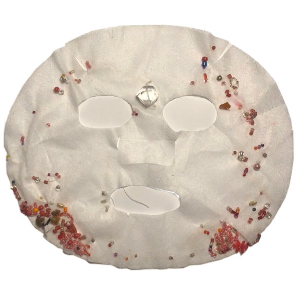 Из последних работ девушки внимание привлекает необычное произведение под названием «Карта кожи». Это обычная белая тканевая маска, на которой бисером вышиты акне.