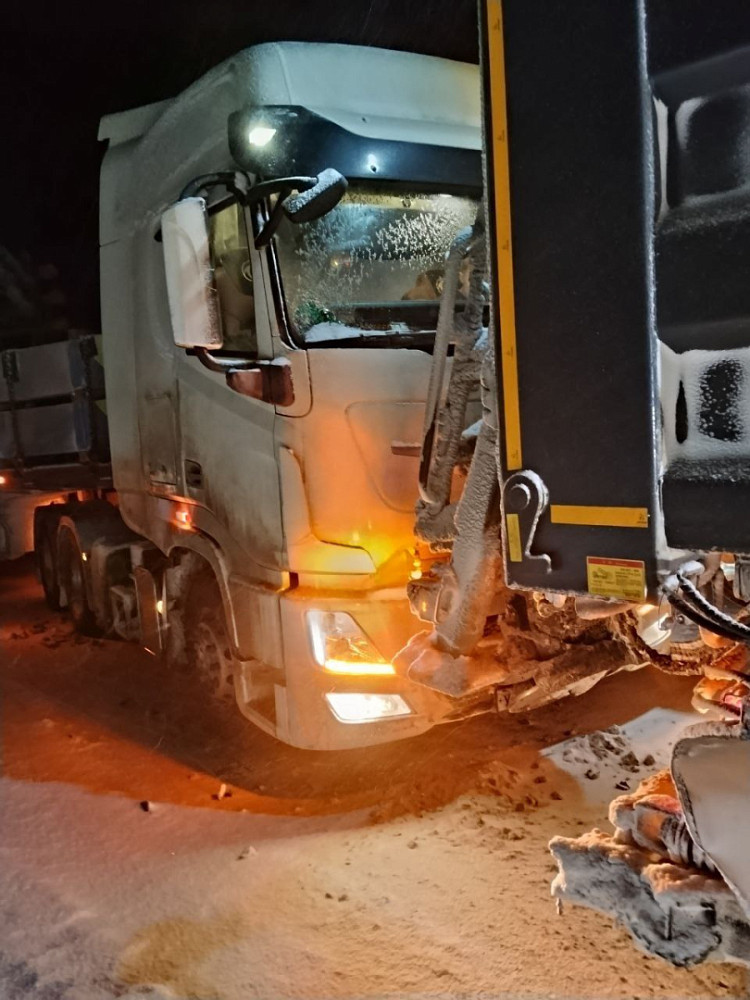 Там столкнулись спецтехника и фура. Водитель комбинированной дорожной машины производил подсыпку на подъеме перед большегрузом, который не смог подняться. В какой-то момент КДМ «стащило» вниз на фуру.