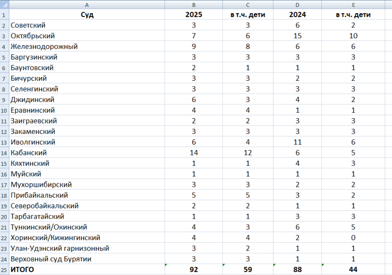 Третье место делят Джидинский и Иволгинский районы. Там в 2025 году в суды поступило по 6 уголовных дел против половой неприкосновенности. При этом по сравнению с 2024 годом в Иволгинском районе ситуация заметно улучшилась, а в Джидинском, напротив, ухудшилась.