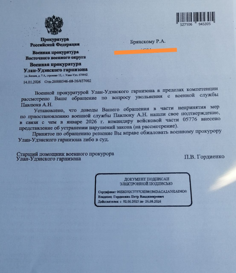 В результате доводы общественности в части непринятия мер по приостановлению военной службы Павлюку нашли свое подтверждение. Прокуратура Улан-Удэнского гарнизона внесла представление командиру войсковой части об устранении нарушений закона.