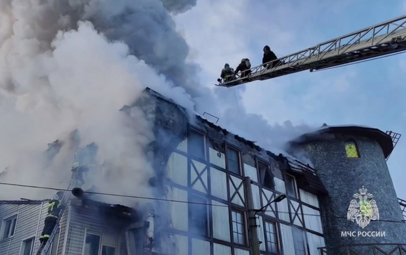 Очевидцы утверждают, что часть крыши обрушилась, пламя уходит на ту часть здания, где расположена стилизованная мельница.