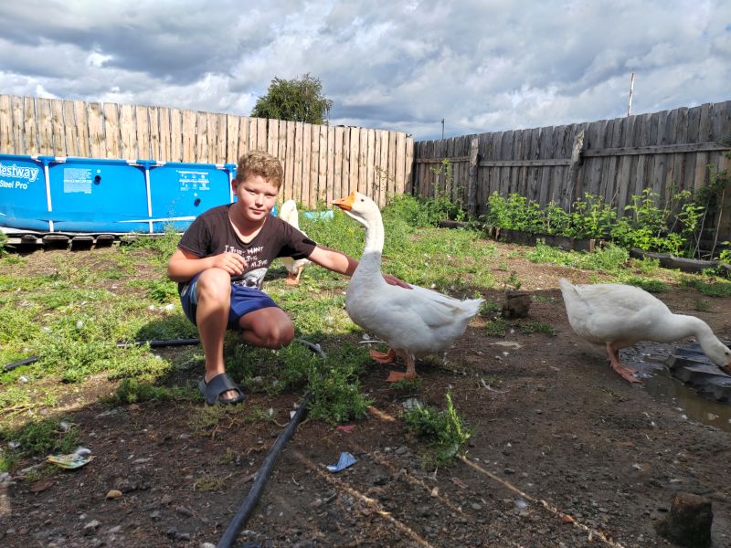 Самые любимые птицы юного хозяина - гуси. Леха, Света и Соня узнают издалека Диму и бегут к нему с обнимашками. Летом школьник держит птиц в отдельном дворике - там они щиплют травку, плещутся в бассейне, который Дима соорудил в этом году, и просто гуляют.