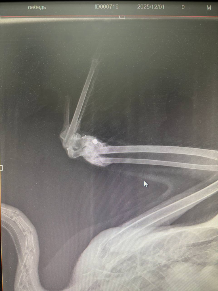 Накануне они доставили пернатого на ветеринарную станцию города Улан-Удэ. Лебедь действительно был ранен – после проведения клинического осмотра, рентгенографии специалисты диагностировали мелкооскольчатый перелом локтевой и лучевой костей крыла.