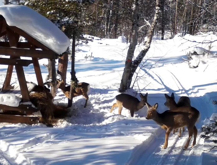 Чтобы помочь лесным гостям пережить сложный период, неподалёку от места встречи инспектор организовал подкормочный стол и повесил фотоловушку, чтобы понаблюдать за копытными.