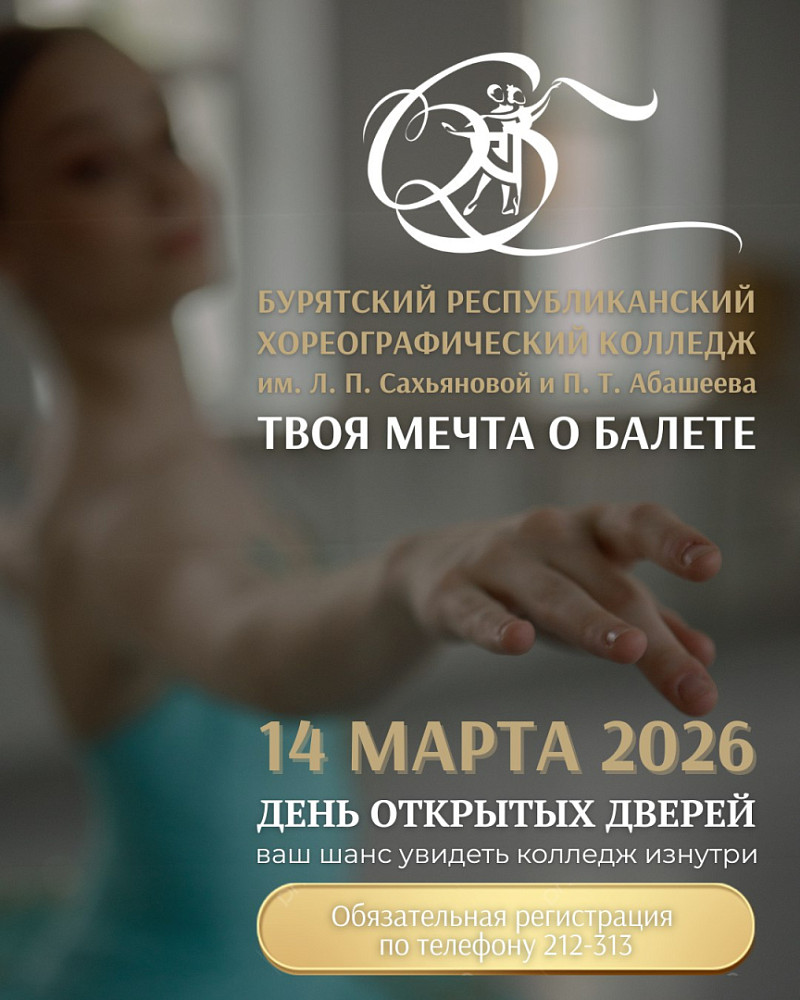 14 марта Бурятский республиканский хореографический колледж имени Л. П. Сахьяновой и П. Т. Абашеева открывает двери для будущих абитуриентов и их родителей. Приходите и загляните в мир, где мечты становятся профессией!