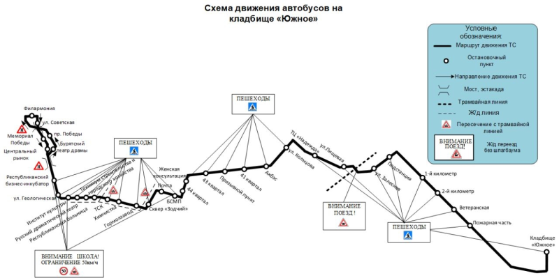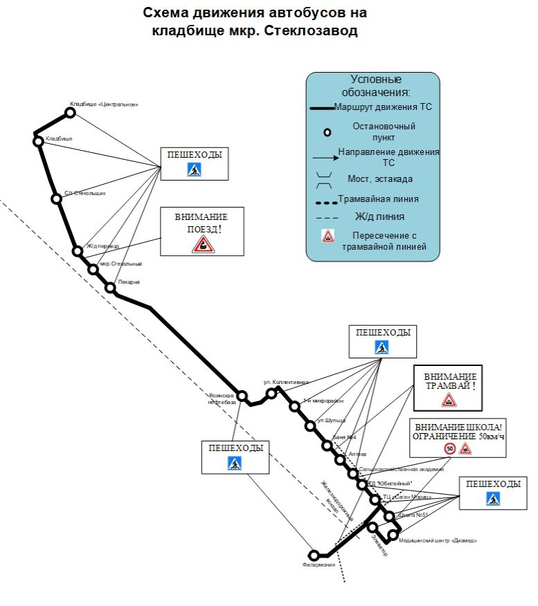Также в данном направлении будет организована работа дополнительного маршрута: Филармония – ул. Балтахинова – ул. Терешковой – ул. Боевая – 40-е кв. – кладбище «Южное.