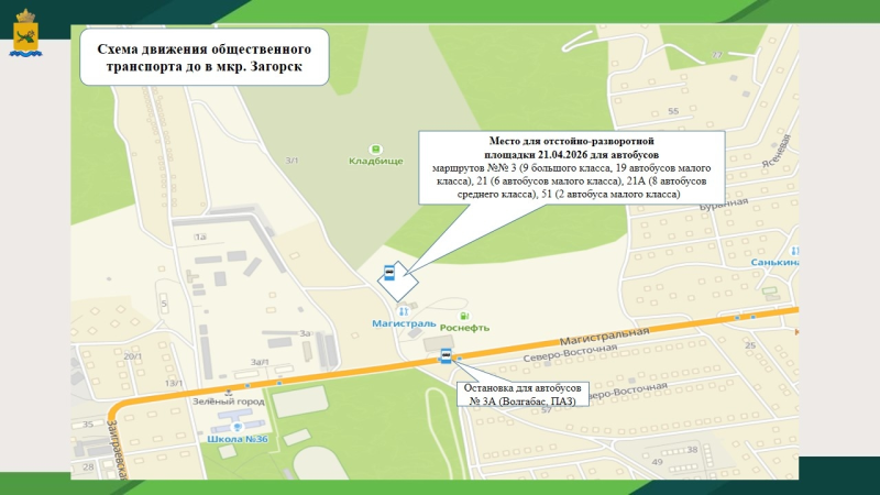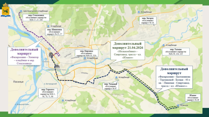 Дополнительно 21 апреля путь следования маршрутов № 3, 21, 21А, 51 будет продлен до кладбища, конечная остановка будет перенесена на площадку вблизи кладбища в мкр. Загорск в районе ул. Магистральная.
