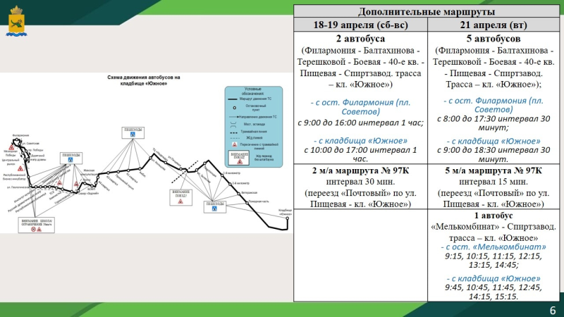 21 апреля по дополнительному маршруту будут работать пять автобусов ПАЗ, отправление каждые полчаса с 8:00 до 17:30 с площади Советов, в обратном направлении с кладбища с 09:00 до 18:30.