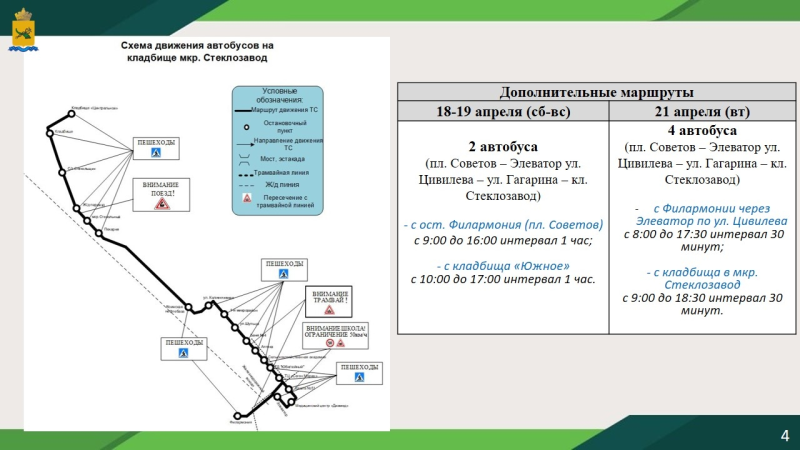 18-19 апреля дополнительно будут работать 2 автобуса ПАЗ по маршруту «пл. Советов – Элеватор – кладбище в мкр. Стеклозавод».