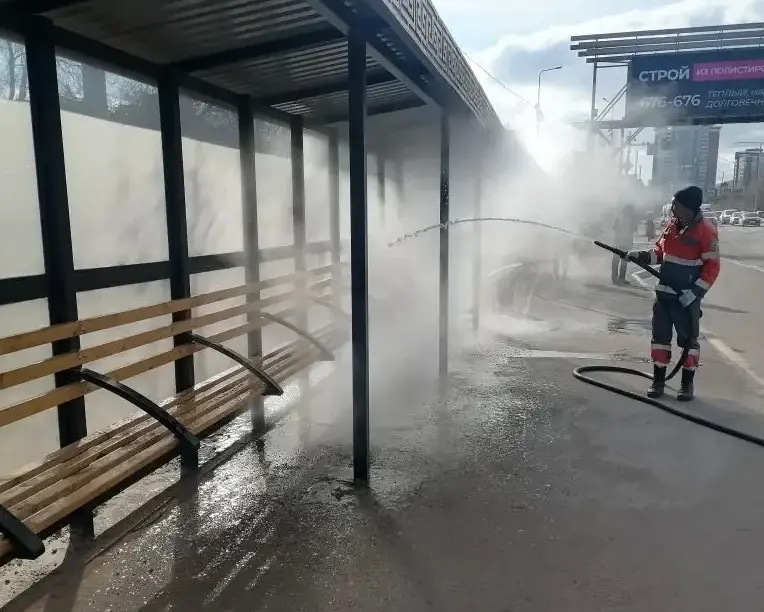 Трамвайные и автобусные павильоны «принимают горячий душ» после долгой зимы. Коммунальщики тщательно очищают лавочки, стены, крыши и информационные щиты. Многие элементы убираются вручную для достижения идеальной чистоты.