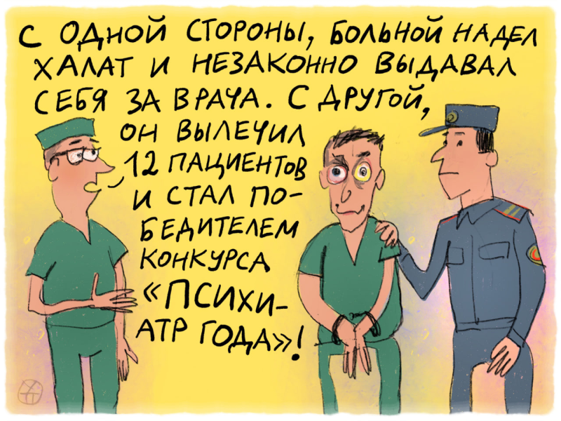 История нашего героя такова: он ударился головой, попал в больницу, после чего очнулся, почувствовав в себе новые силы, надел больничный халат, больничные тапки и устремился навстречу приключениям. А они тоже устремились к нему в виде сотрудников полиции, которые его и повязали.